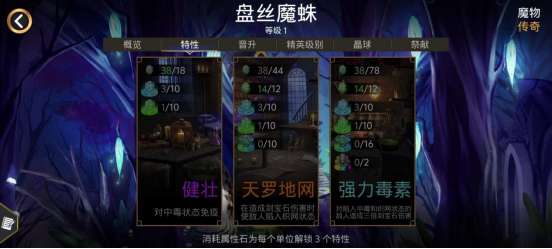 1、消耗规则:每一个特性都需要特定颜色和种类的属性石来解锁,如图所示,盘丝魔蛛作为一张高品质卡牌,它的解锁需求是逐渐递增的。