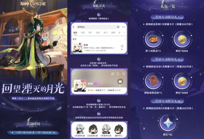 首先是超话「月之二」版本第二期签到互动活动现已开启,如图所示,依旧是每个版本必备福利,各位旅行者在活动期间,通过在原神超话累计签到1天/3天,即可领取并在游戏内兑换对应礼包。