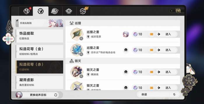 刷取时,玩家们可直接在指南界面找到所要刷取的材料本和进阶本,并点击进入按钮前方的助燃卷标识,即可进入快速刷取功能开启刷本作业,当然也能前往各地图,找到对应的副本入口,同样能在下方看到快速刷取的标识。两种方法都能用助燃卷快速获得玩家想要的资源,玩家可按习惯来选择合适自己的方法。刷取时,使用助燃卷消耗掉的体力同样能完成每日中的“消耗120体力”的任务,但无法完成“击败20敌人”、“击破敌人弱点”等需要进入战斗才能触发的任务,还望各位多注意。