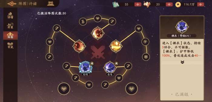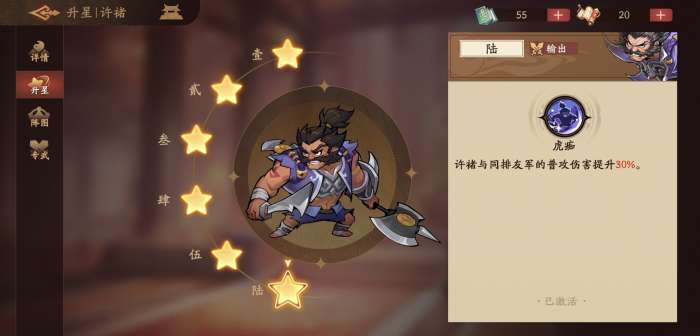 许褚属于游戏中的输出型角色,他普攻造成的伤害是风属性。必杀技开启后进入裸衣状态,三回合内不可驱散,通过降低护甲来获得更高额的普攻伤害。天赋效果是在同排友方普攻时,许褚有几率再进行一次普攻,释放必杀后自身行动提前,裸衣状态下暴击提升,达到最高星级后,许褚和同排友军的普攻伤害都获得提升。