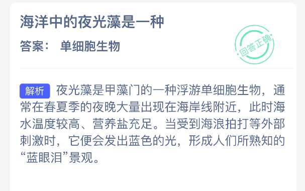 海洋中的夜光藻是一种?【神奇海洋】12月13日新题目已开答!正确答案现已公布,点击领取拼图,一起为修复海洋生态贡献力量!今日正确答案是:【单细胞生物】。夜光藻是甲藻门的一种浮游单细胞生物,通常在春夏季的夜晚大量出现在海岸线附近。