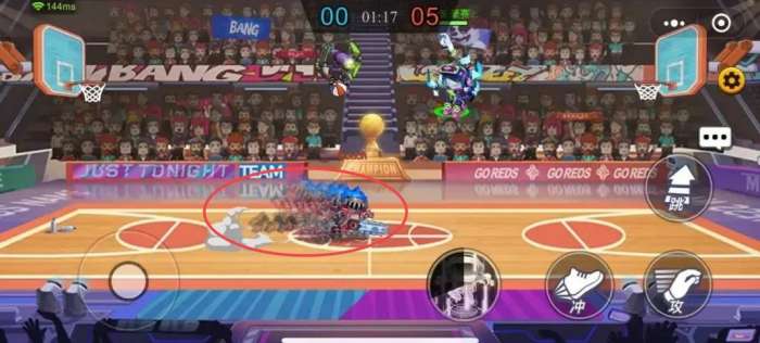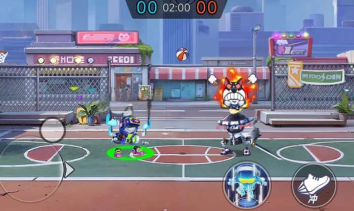 首先是最基础的操作,左右移动屏幕左边的摇杆即可使角色移动,而如果将摇杆向下拖动的话,则会进入胯下运球的状态,但是该状态会消耗体力。点击两次跳跃时可触发双跳,拦截敌方的高球,但球在自己手中时该技能禁用。点击冲字按钮,可向指定方向移动一段距离并打断敌方的运球。如果你在敌方灌篮的时候快速跃起并点击盖帽按钮,则可成功盖帽,从敌人手下抢分。
