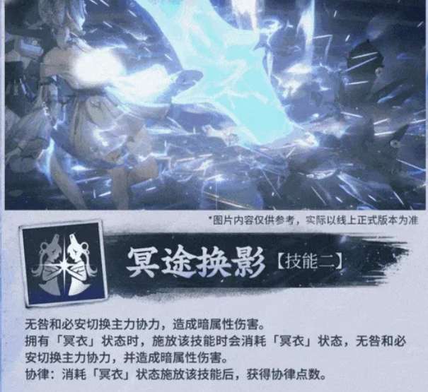 技能二"冥途换影",是切换主力和协力角色的,同样造成暗属性伤害。逻辑和技能一差不多,有"冥衣"状态的话消耗掉就能多打一段,也能拿到协律点数。技能一和技能二都没有冷却时间,想切就切,操作上比较自由。