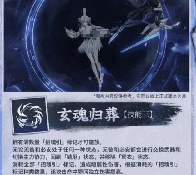 技能三"玄魂归葬",要攒满"招魂引"标记才能放。放出来之后,无论当前是什么状态,都会回到"镇厄"状态,"冥衣"也会被清掉。然后消耗全部标记造成一次暗属性伤害,而且根据消耗的标记种类数量,伤害还会额外提高。所以尽量攒齐四种标记再放,伤害最高。
