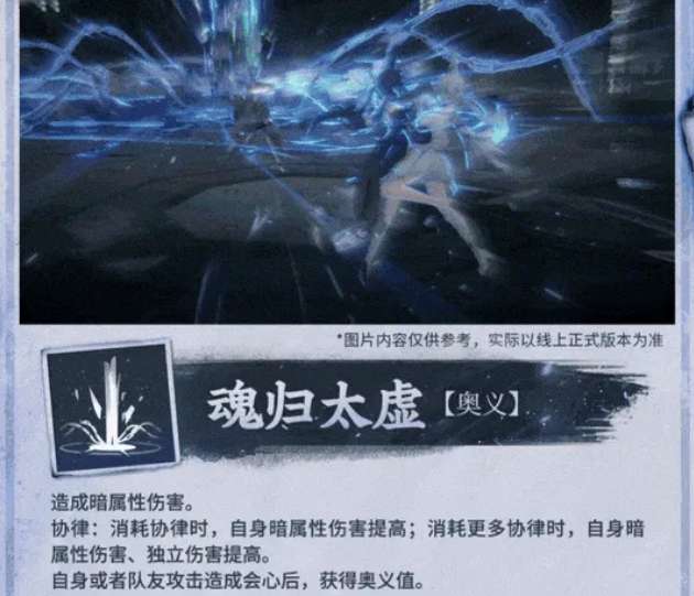 奥义"魂归太虚",造成暗属性伤害。消耗协律可以提升暗属性伤害,消耗更多协律的话,独立伤害也会跟着提高。自己或者队友打出会心的时候,会获得奥义值,所以队伍里会心率高的话,奥义的积累速度也会快一些。