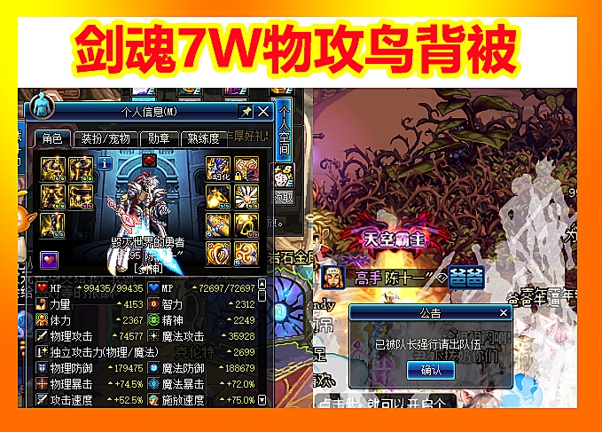 “地下城与勇士之小狐狸君爱谈游戏电竞”第四百五十八期《DNF剑魂太难了:4000力量7W物攻,刷鸟背都被踢,玩家:独立太低》,随着国服特色改版,剑魂加入了34仔、纯C的开关之后,风评就一直不好。现在甚至引起了许多玩家的误解对待,见到剑魂不看面板都直接T出队伍。某些团长故意找茬进团就当工具人用,面板也不看就要切斩钢!近日有小伙伴反应,自己的大号大个鸟背都被踢了,但道理这面板带奶拖34仔酱油都没问题的。老规矩搞快点,直接上结论图:
