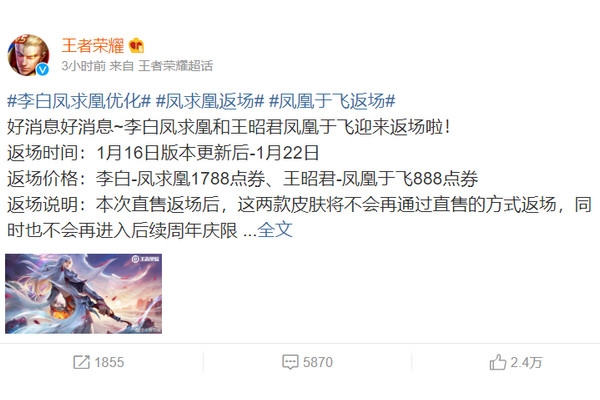 返场价 格:李白-凤求凰1788点券、王昭君-凤凰于飞888点券。