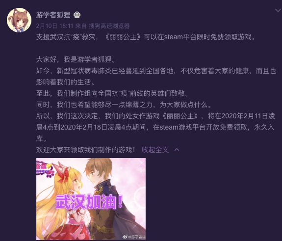 昨日,《丽丽公主》主催游学者狐狸在微博宣布:为向武汉加油,《丽丽公主》将在2020年2月11日凌晨4点到2020年2月18日凌晨4点期间,在steam游戏平台开放免费领取。