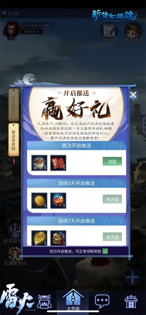 9月26日10:00至10月23日23:59,在互通版开启消息推送通知并连续登录达到一定天数即有好礼相赠,奖励将以邮件形式发送,请及时在端游领取。