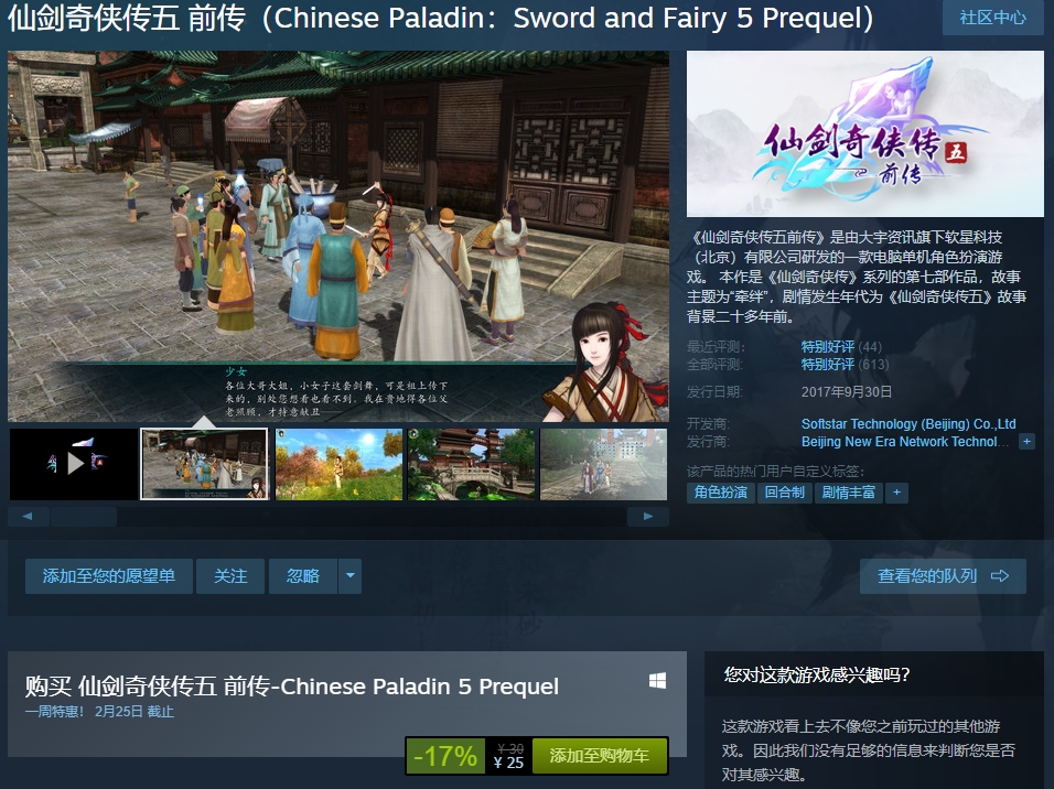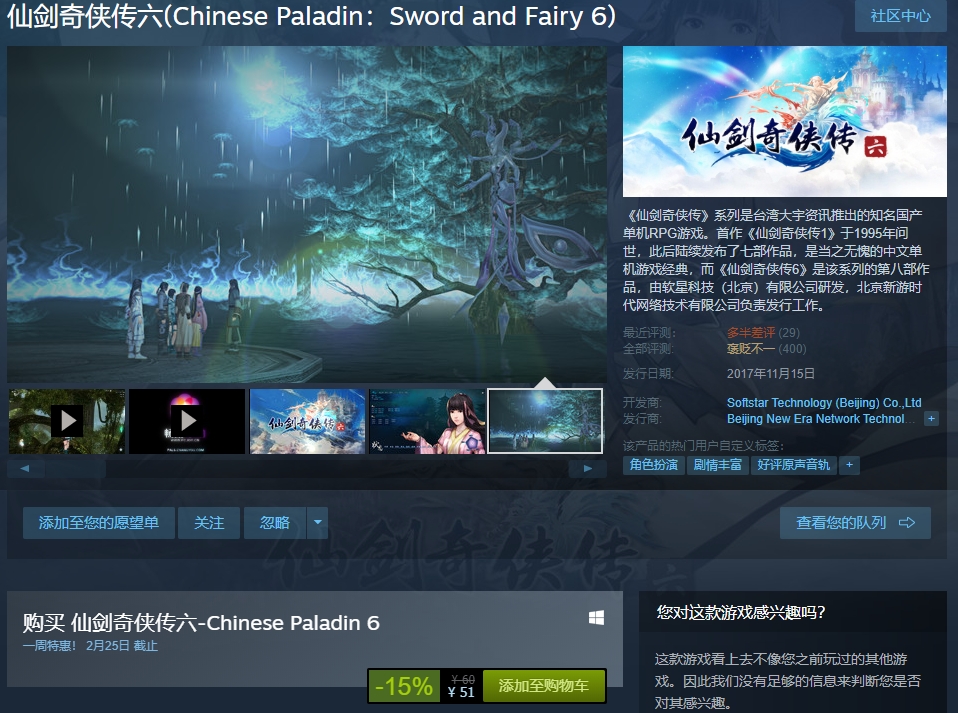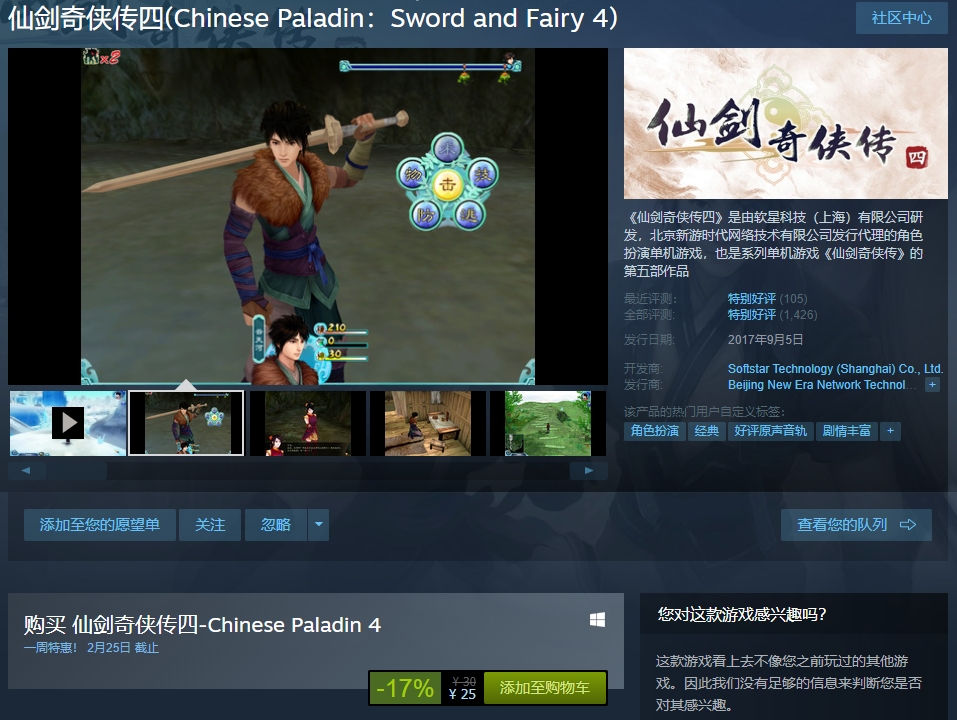 今日(2月18日),知名国产RPG《仙剑奇侠传》系列作品在Steam商城开启一周特惠,包括《仙剑奇侠传4》、《仙剑奇侠传5》、《仙剑奇侠传5:前传》、《仙剑奇侠传6》四款作品优惠促销中,特惠截止日期2月25日。