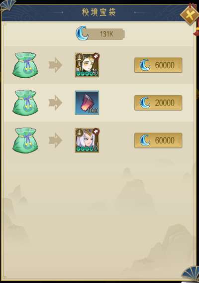 4. 关卡中分为挑战关和奖励关,每3关会遇到一次奖励关,无需挑战即可获得奖励,奖励中包含了水月石、铜钱以及随机的秘境宝袋,点击右下角【宝袋】可查看宝袋具体获取情况,消耗水月石可进行奖励兑换,可兑换海量材料、5星英雄奖励
