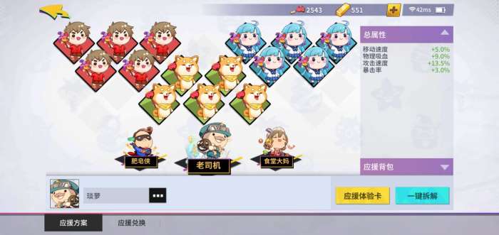 应援分享,琰萝在1,2技能打完后只能靠普攻输出,因此对于普攻的强化就至关重要,老司机能让琰萝的伤害加深加上移速加成,打人必备,食堂大妈能增加线上续航能力,肥皂侠能使琰萝快速清兵同时赠送大幅经济优势。移速吸血和攻速都是针对琰萝的普攻强化而出的,让琰萝能粘能吸还能打,快速刷新强化普攻。3%的暴击率只要打出来就是必杀敌方英雄,所谓富贵险中求,必不可少。