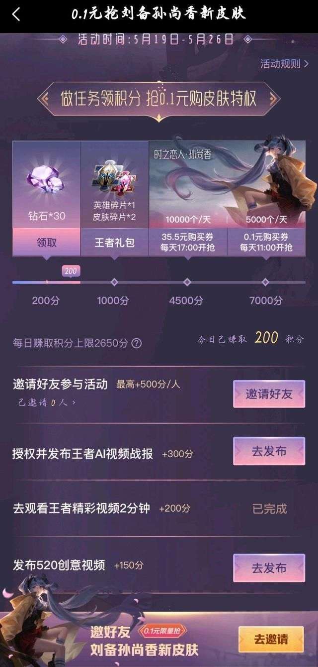 ※用户如选择孙尚香任务线:用户积分累计达到4500分可兑换时之恋人·孙尚香 35.5元购买券(即用户仅需使用35.5元即可购买该皮肤),【每日限量10000个】;用户积分累计达到7000分可兑换时之恋人·孙尚香 0.1元皮肤购买券(即用户仅需使用0.1元即可购买该皮肤),【每日限量5000个】。