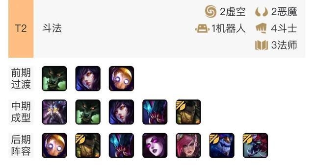 前期灵活使用任意强势羁绊进行过渡,最佳的三人口阵容为豹女+狼人+机器人组成2狂野+2斗士的羁绊效果。在拥有狐狸之后可以将豹女替换,加入卡牌大师和莫甘娜,在五人口时组成2狂野+3法师+2斗士的羁绊效果。