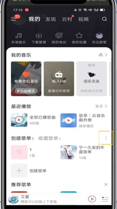 2、点击我的,点击歌单旁的三个点