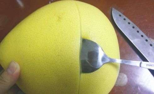 用汤匙圆头部分戳入上半部分的柚子,然后慢慢戳入柚子后,用力将汤匙划上一周,如果不能一次性划上一周,可以取出汤匙后再戳入柚子中。