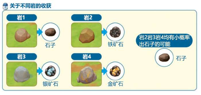 游戏中共有三个矿区,分别对应牧场的三个区域,需要依次解锁。第一个矿场在初始牧场的西边,有四块石头挡住。