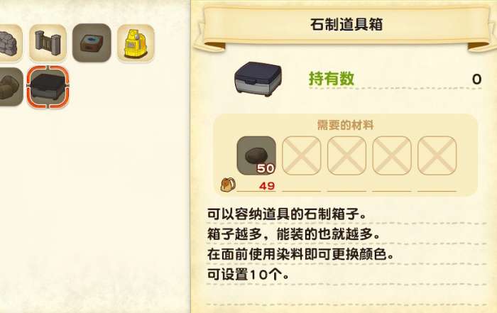 道具箱有很多种,分别用不同的素材,如果道具箱放满了就做新的道具箱出来放东西。