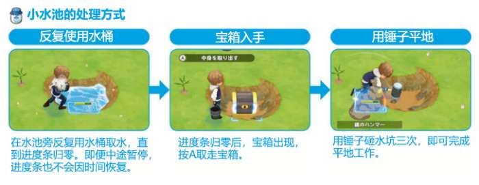 关于宝物的获得,大家参考下面这张图,基本流程就是水桶取水,拿走宝箱,锤子平地。建议把水桶至少升到铁级以上再进行。