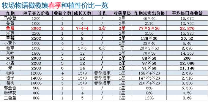 四是种植作物。从性价比的角度来说,建议大家在春季种植黄瓜,每日利润最高。但黄瓜最多只能种一拨,第二拨会过季枯萎。