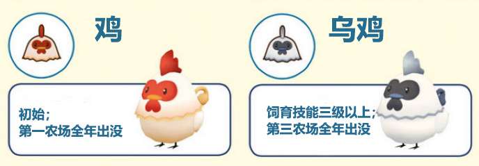 鸡一共只有两种,乌鸡要饲育技能LV3以上且解锁牧场三区才能发现。