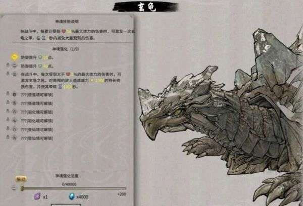 在战斗中每积累受到50%最大体力伤害时可以激发一次玄龟之甲,在7秒内减少大量伤害。