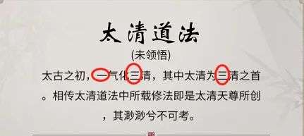 解读:根据红字同名书卷提示找到八阶功法【太清道法】,让我们来看【太清道法】的描述:太古之初,一(1)气化三(3),其中太清为三(3)清之首..................