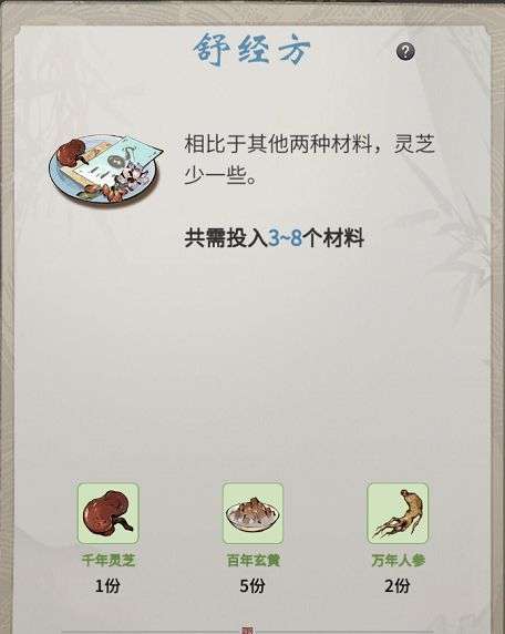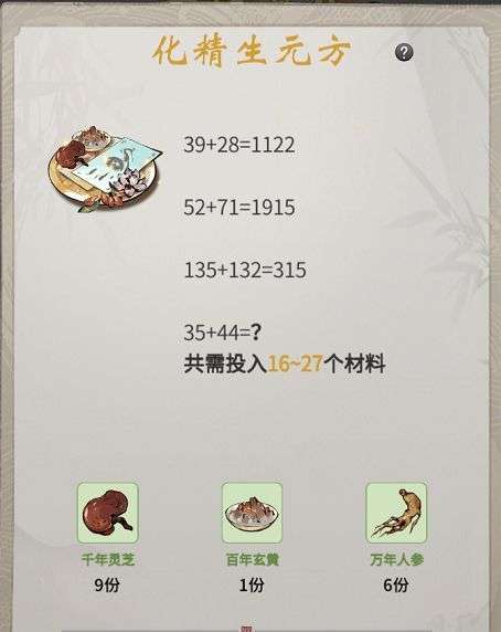解读:和温胆笺一样,属于逻辑思维数学题,此时最多投入十五种材料,人参=灵芝+玄黄,是3、3、6没跑了!