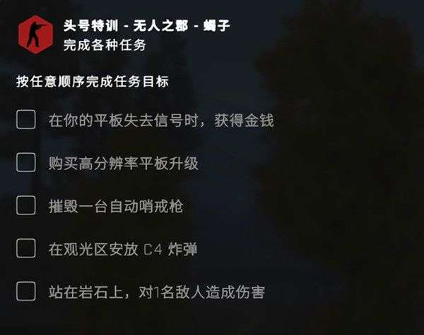 csgo头号特训平板失去信号咋回事,这个是无人之郡的任务,在里面需要完成五个任务才可以的,此次这些怎么达成呢,头号特训平板失去信号怎么完成。