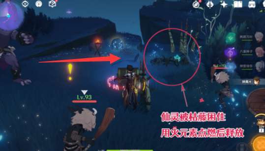 仙灵1:位于北边山坡上,被枯藤困住,需要用火元素角色点燃藤蔓释放仙灵。