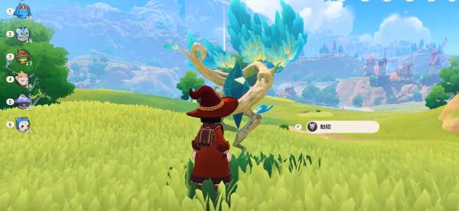 大家可以先熟悉一下魔力之源被唤醒之后的状态。这对于玩家而言,在探索地图时就可以迅速的区分已经激活,还有没有激活的模拟资源,可以避免做无用功。我们需要重点找到那些还没有被激活的魔力之源,这一类模拟资源就是我们需要交互操作的目标。当我们来到未被唤醒的魔力之源之前,可以先进行基础性的交互操作。此时游戏界面就会有一个明确的提示,只需要扔出一只任意的精灵,就可以唤醒。