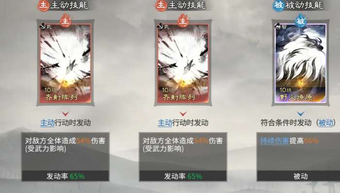 技能配置方面,魏延主选主动技“齐射阵列”,发动率65%,对敌方全体造成54%武力伤害,并与流血机制形成高频联动;被动技“野火燎原”提升66%持续伤害,使流血效果实际倍率翻倍。曹操主动技推荐“一夫当关”,72%概率触发,降低自身14%所受伤害,强制引导敌方集火目标,有效保护后排孙权的输出环境。孙权主动技选用“惑心挫志”,67.5%发动率,可对敌方三名单位造成60%魅力伤害,并有20%概率附加持续两回合的25%虚弱效果,显著削弱敌方关键角色行动效率。