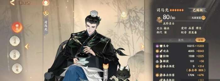 司马光装备推荐首选离火,衣帽属性爆抗,鞋子爆伤,配饰武器暴强,猫属性五攻击加成,猫技能1/1/1,九世灵推荐翡翠珠珠(或者雪青也可),司马光由于被动“故我”存在,在己方队伍中出手越慢伤害越高,而且速度比目标每慢7点敏捷就会获得一层增伤,所以配速方面需要稳定在尾速。