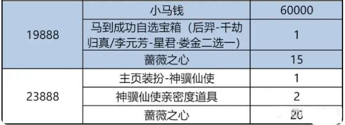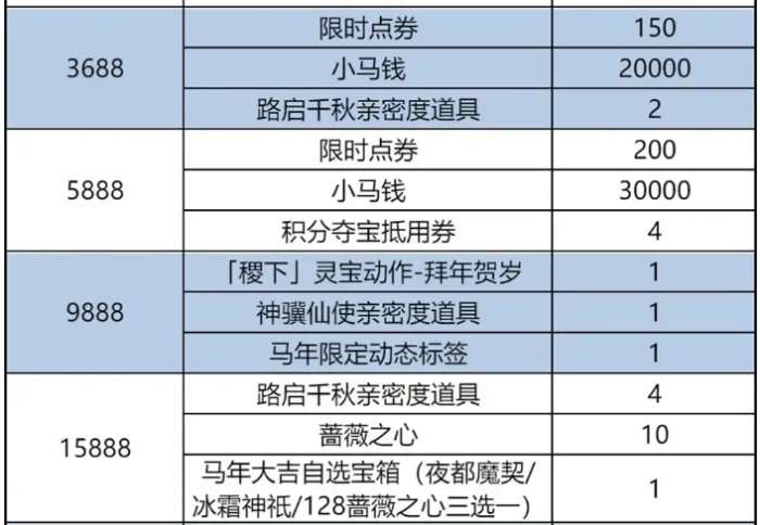 春节累计充值最高档次为23888点券,达到19888时就能获得累计充值的限定皮肤李元芳-星君·娄金、后羿-千劫归真二选一。15888点券就能获得曹操-夜都魔契、盘古-冰霜神祇、蔷薇之心x128三选一。