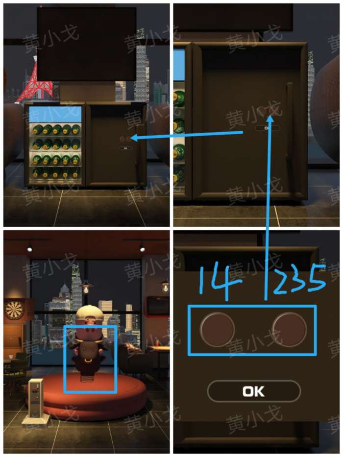 8.点击柜子右侧柜门上的密码锁,根据上面的数字提示,结合各场景酒杯上的水果装饰和杯垫数量线索,调整密码锁