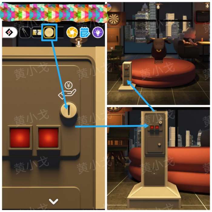 28.点击柜子右侧柜门上的密码锁,根据[摇摇牛]场景猪猪骑车方向顺序,按顺序按下按钮