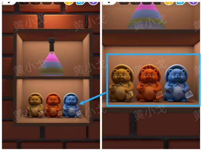14.点击电视机前面的柜子,点击左侧柜门上的密码锁,根据上面的图案提示,结合柜台上杯子的把手形状及杯子中的饮料容量线索,调整密码锁