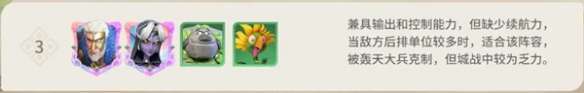 2、兼具输出和控制能力,适合面对后排单位较多的敌方阵容,缺乏续航,同时被轰天大兵克制,往往在城战中较为乏力。
