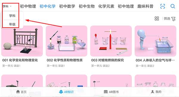2、在AR知识页面,点击右上方选择:学科/年级;