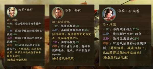6、每个队伍最多只能使用一个治军战法,而因为是先锋体验,在综合测试过后,战法的效果数值或许会有调整,所以仅先大致了解玩法即可。目前来看,除了兵锋和奇计良谋,肉眼可见的强度低之外,其他战法都有非常值得期待的强度。例如挫锐指定敌方主将虚弱,有效针对主将输出的速攻队;卧薪尝胆转为突击战法对于孙权的提升,结盟蹭友军的治疗量对SP貂蝉增加了治疗频率和溢出量,都有能够作为战法搭配的强度。