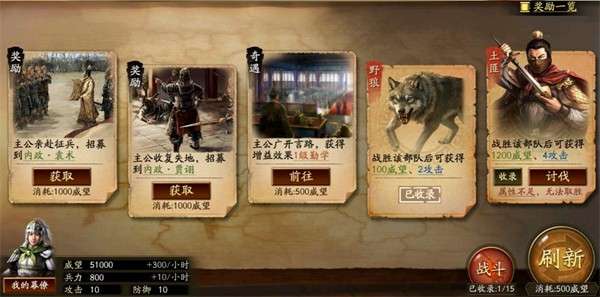 4、而此次剧本重中之重的玩法是主界面右下角的历练玩法。点击进入后我们可以通过右下角的事件来获取各类的奖励,其中有遗忘战法100%返还战法点,提升武将属性和提供资源加成等。刷到的战斗事件如果显示无法取胜,可点击收录暂存,待战斗力提升后,从战斗里进入讨伐获得奖励。但最重要的、也是影响阵容搭配相关的是这十个治军战法,与之前的转战法或拓印战法不同。