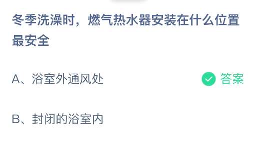 冬季洗澡时,燃气热水器安装在什么位置最安全?支付宝小鸡课堂开课啦!每天花一分钟答题赚饲料,喂喂小鸡就能贡献爱心啦!轻松又意义十足!2026年1月25日蚂蚁庄园的小鸡课堂题目正确答案是【浴室外通风处】,冬季洗澡时,燃气热水器安装在浴室外通风处。