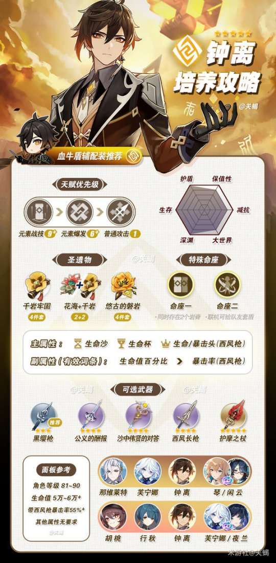 「钟离」是一名五星长柄武器角色,掌握岩元素能力,被认为是提瓦特大陆上最强的盾辅。她的盾牌非常厚实,持续时间长久,即使在深渊高压环境中也能够抗衡,而且无需消耗命座,完全可以在0命完全体的状态下进行培养,因此培养成本也非常低。