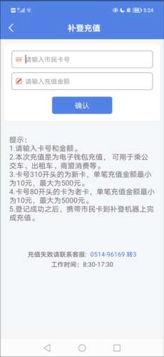 4、最后在补登充值界面输入市民卡卡号和充值金额后,点击确认按钮即可完成充值。