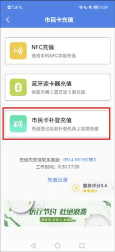3、然后,在市民卡充值界面找到并点击“市民卡补登充值”选项;