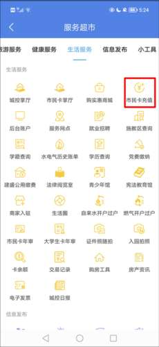 2、在服务超市界面的生活服务一栏中找到并点击“市民卡充值”选项;