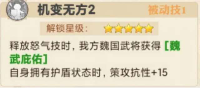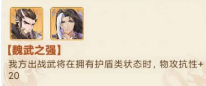 此时他只要是拥有护盾保护的话,那么这个状态可以为他带来策攻击抗性的15点增强,所以在对面如果用到策略攻击效果比较多的情况下,我方可以抵抗的数值也比较高,那么这里通过郭嘉跟曹操搭配在一起,他们可以触发的一个连携效果叫做魏武之强。这个能力就是让我方出战武将在拥有了护盾类型的状态时,让物攻的抗性增加10点,效果放在这里的话其实大家就可以发现,魏国里面基本上大家通过连携触发的这一效果当中,大部分都是带有抗性的能力,所以这个阵容是非常有自我生存强度的一个搭配。
