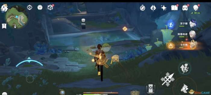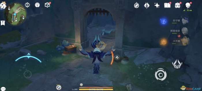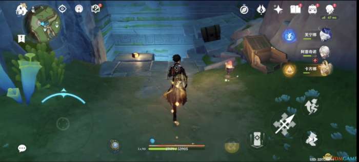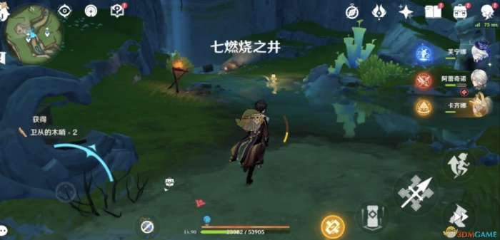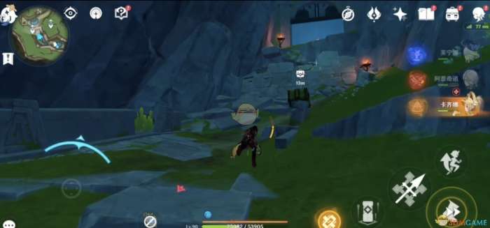 2、线路一是直接走到悬崖的位置跳下去,在右侧会有洞窟,里面可以看到看守宝箱,清怪后打开门即可进入七燃烧之井。