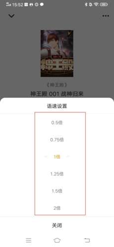 2、在弹出窗口中,我们可以选择从0.5倍到2倍一共六档不同的语速,点击选择自己喜欢的,就能成功设置了。