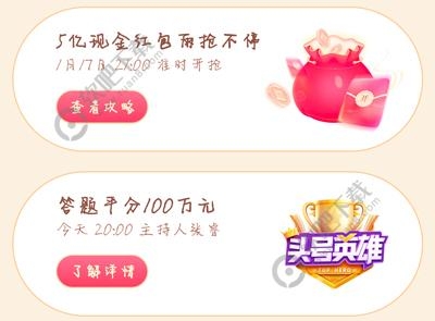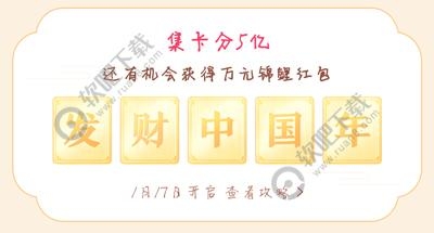 集卡分五亿:在1月17日开始集卡,需要收集到发、财、中、国、年五张卡,集齐之后可参与瓜分五亿的活动,还有机会获得万元锦鲤红包。